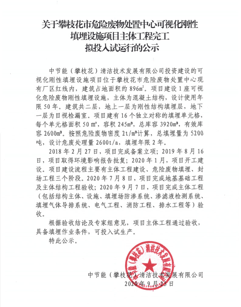 關(guān)于攀枝花市危險廢物處置中心可視化剛性填埋設(shè)施項目主體工程完工擬投入試運(yùn)行的公示